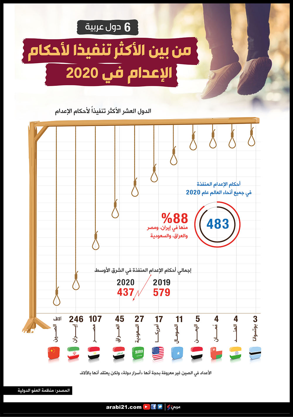 أظهر تقرير نشرته منظمة "العفو" الدولية، أن ست دول عربية من بين قائمة الدول الأكثر تنفيذاً لأحكام الإعدام في العالم لعام 2020.