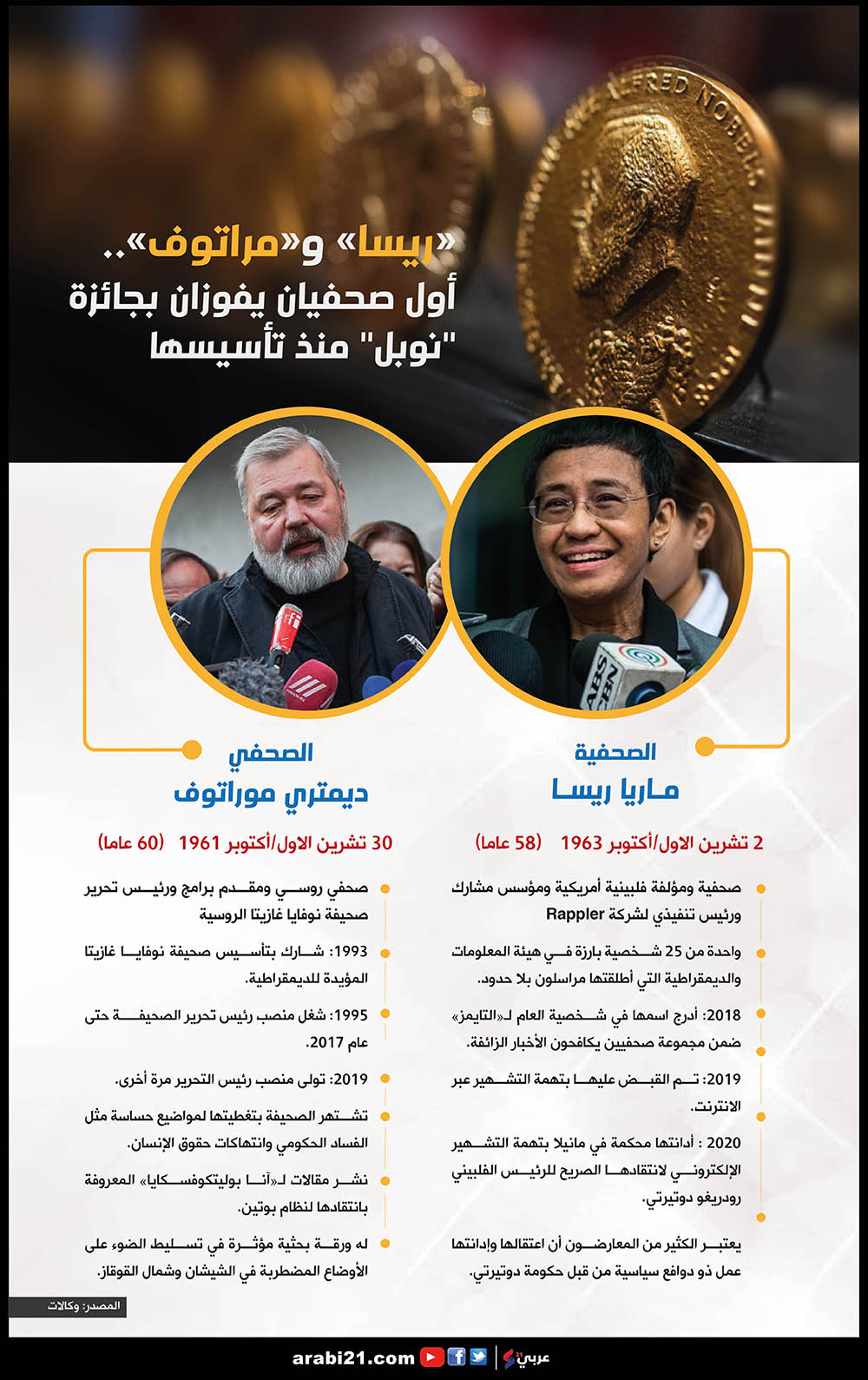 أعلنت لجنة نوبل النرويجية، الجمعة، عن منح جائزة نوبل للسلام للصحفيين الفلبينية ماريا ريسا، والروسي ديمتري موراتوف، وذلك تقديراً لـ"كفاحهما الشجاع من أجل حرية التعبير في بلديهما".